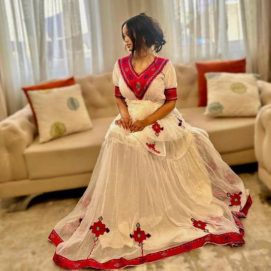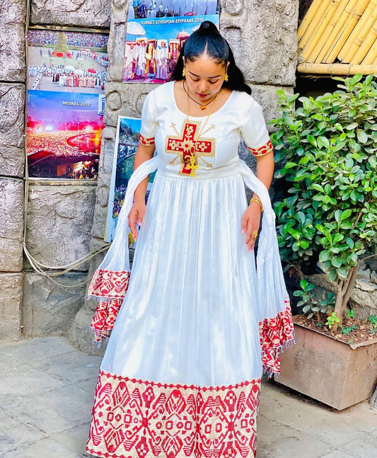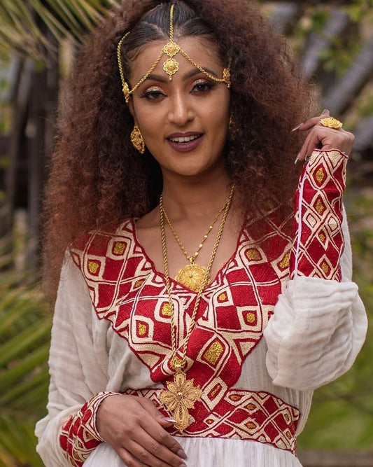 Beautiful Red Menen Habesha Dress with Stunning Adornment