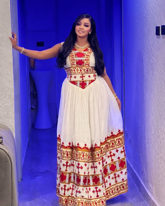 Beautiful Sleeveless Habesha Dress with Intricate Red and Gold Design Ethiopian Dress For Weddings.