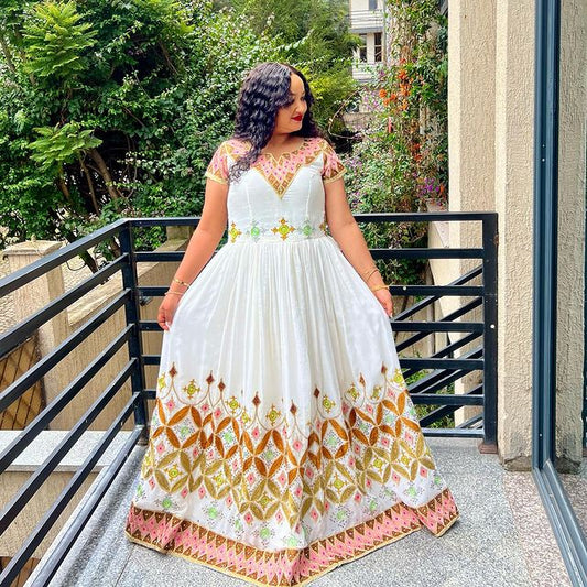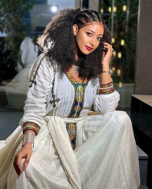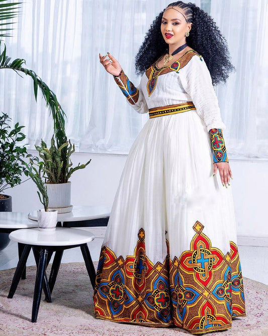 Vibrant Traditional Ethiopian Outfit :with Geometric and Colorful Embroidery Habesha Dress