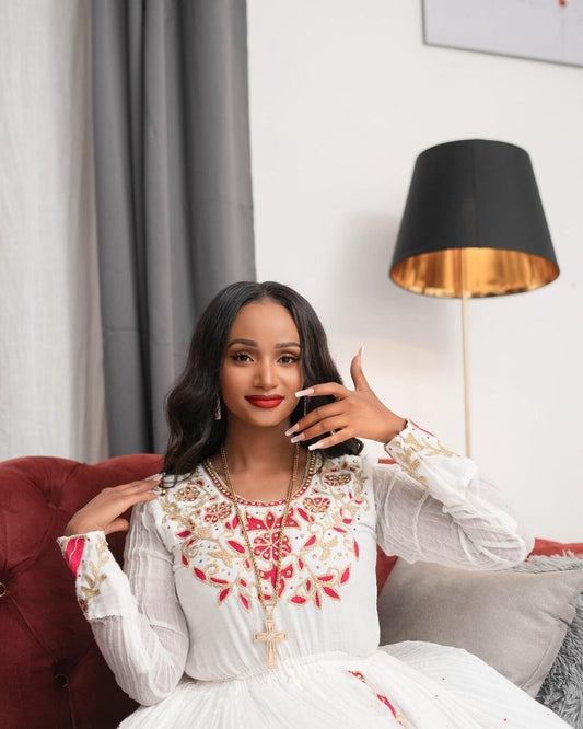 White & Red Ethiopian Traditional Dress Habesha Kemis for Special Occasions Handwoven Habesha Dress 157