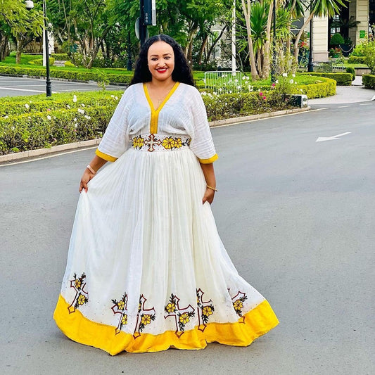 White And Yellow Traditional Ethiopian Dress Modern Embroidery Design Habesha Dress Handwoven Habesha Kemis 182