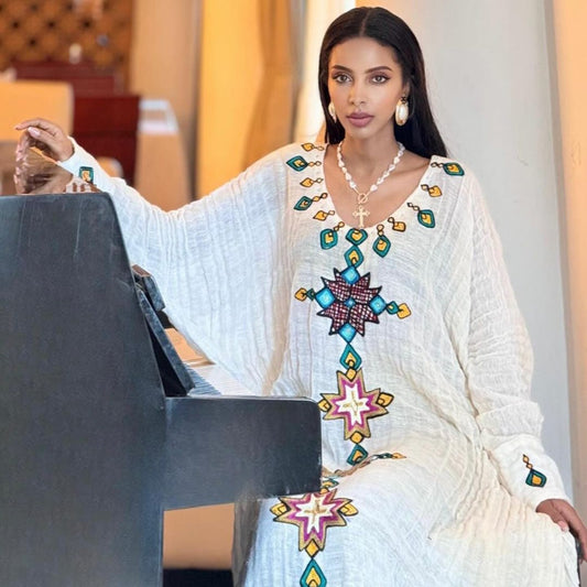 white embroidered Ethiopian traditional dress Habesha Kemis For Special Celebrations Long Sleeve Habesha Dress 176