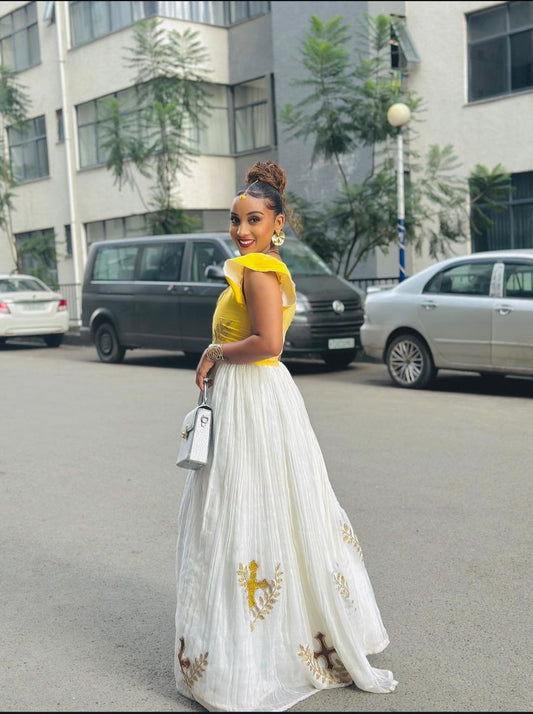 Vivid Yellow Habesha Dress: with Shimmering Cross Detailing Traditional Ethiopian Dress Embroidery Beautiful Habesha Kemis