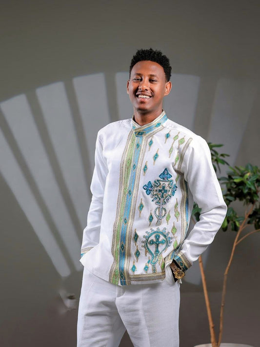 Elegant Ethiopian Men’s Outfit with Blue and Green Cross Motifs for Celebrations Includes Shirt and Pants