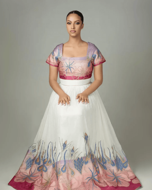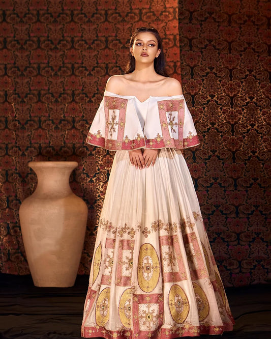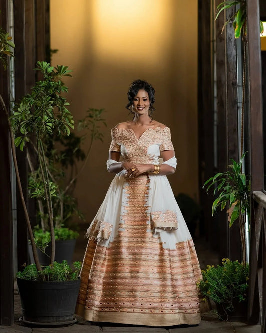 Step into your special day with grace in our handmade habesha wedding dress. Featuring elegant Habesha kemis for brides, bridesmaids, and cultural ceremonies. Eritrean wedding dresses hand crafted just for the occasion.
