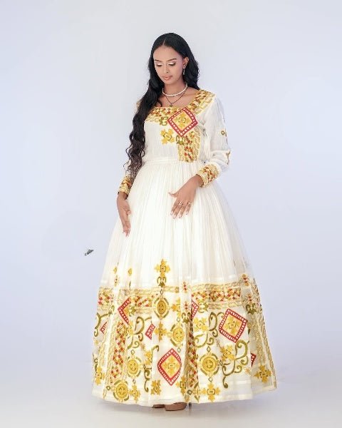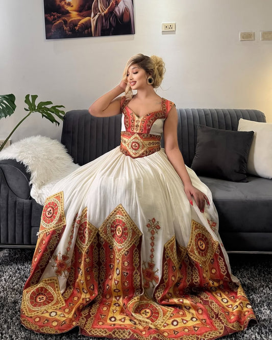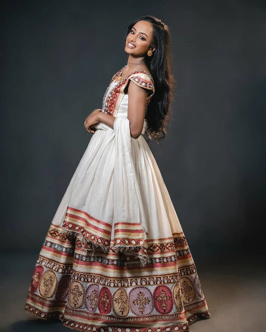 Vibrant Habesha Wedding Dress with Intricate Multicolor Embroidery