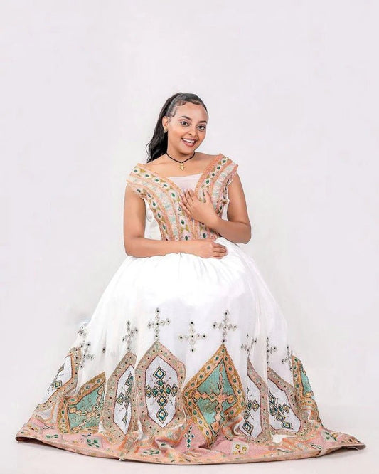 Delightful Colorful Ethiopian Wedding Dress: Beaded Detailing on Traditional Habesha Wedding Gown
