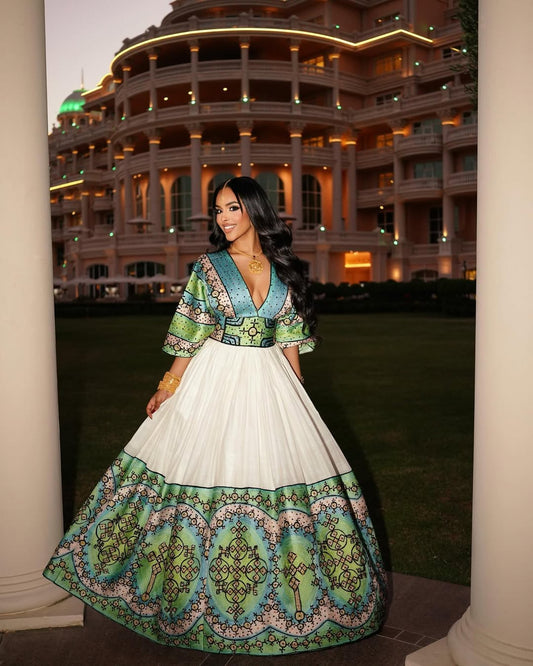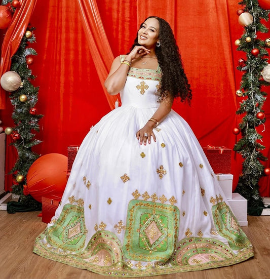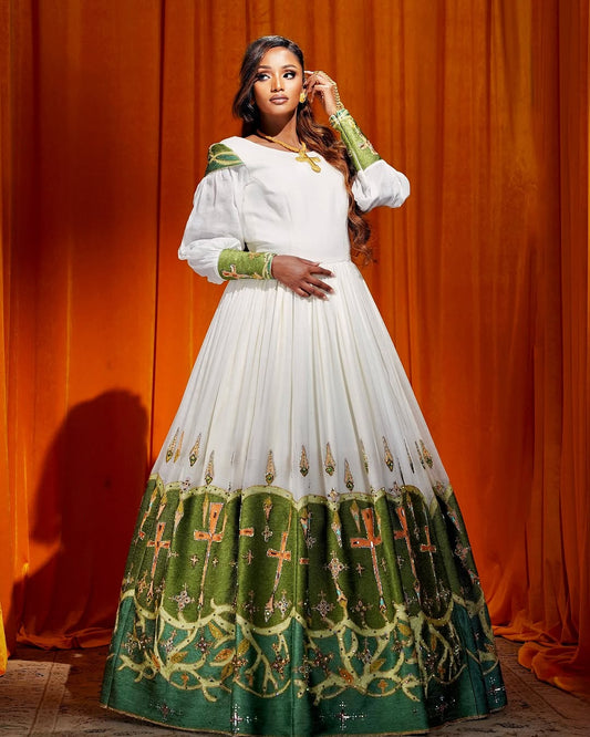 Glamourous Green Habesha Wedding Dress: Shimmering Ornaments on Traditional Ethiopian Dress Elegant Ethiopian Wedding Dress