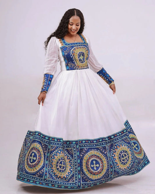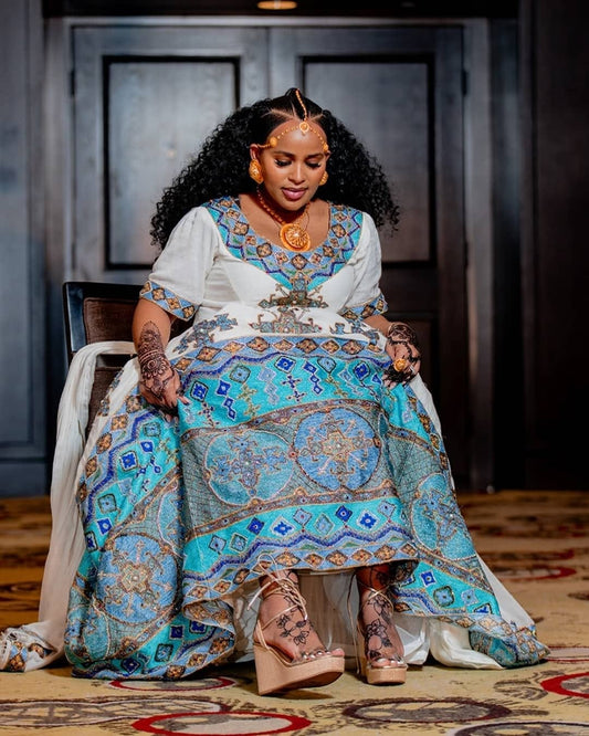 Stunning Blue Traditional Ethiopian Wedding Dress: Circular Handcrafted Detailing on Habesha Wedding Dress