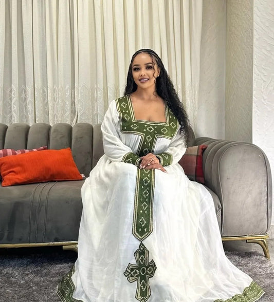 Royal Habesha Kemis White Cultural Dress with Green Tibeb Accents Festive Habesha Dress 230