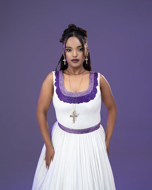 Igniting Beauty with Purple Ethiopian Clothing: Handcrafted Colorful Geometric Embroidery on Traditional Dress Modern Habesha Cloth