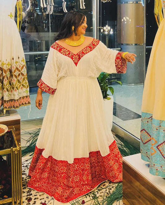Fashionable Beige Ethiopian Dress: with Red Wide Habesha Clothing Handmade Excellence for Any Events Eritrean Dress