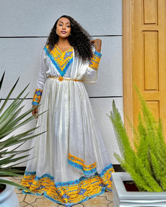 Pretty Habesha Dress with Blue Embroidery: for All Types of Cultural Occasions Ethiopian Dress