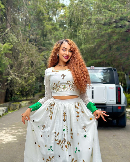 Ageless Habesha Look with Gonder Draping Embroidery Design: Traditional Ethiopian Dress