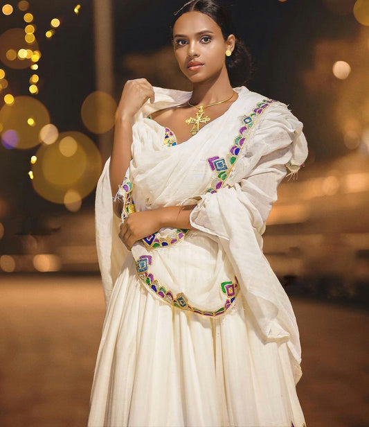Majestic Embroidery Designed Habesha Dress: with Multicolored Stitches Traditional Ethiopian Dress