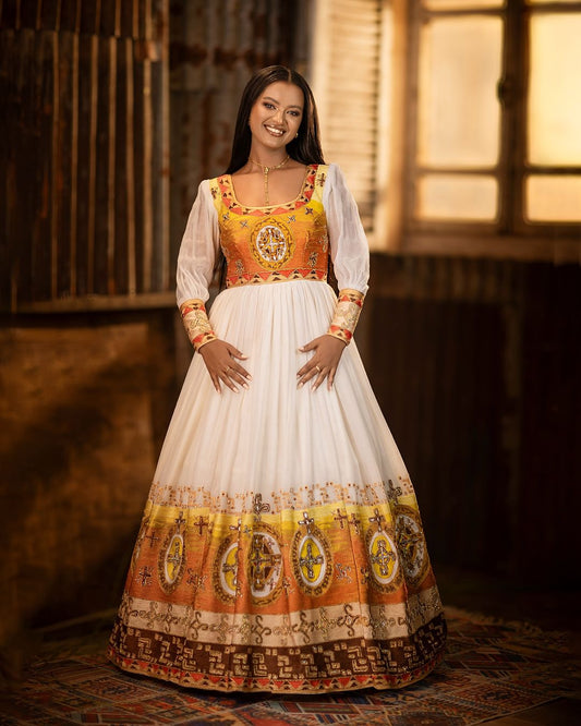 Golden-Orange Cross-Stitched Modern Habesha Dress: Relaxed Fit for Outdoors Traditional Ethiopian Dress