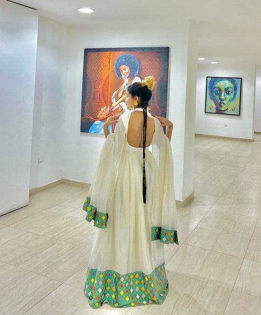 Graceful Light Cream Habesha Dress with Colorful Traditional Detailing: Ethiopian Dress for Cultural Ceremonies