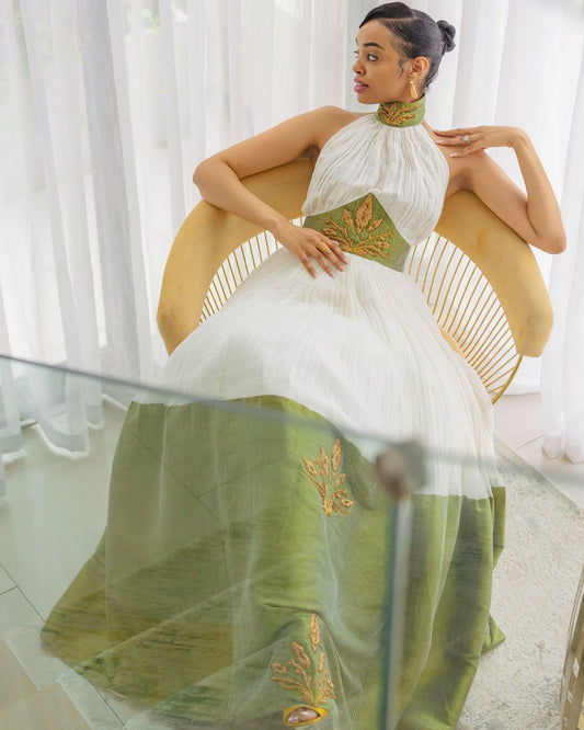 Marvelous Habesha Dress with Green Detailing: Traditional Ethiopian Dress for Events
