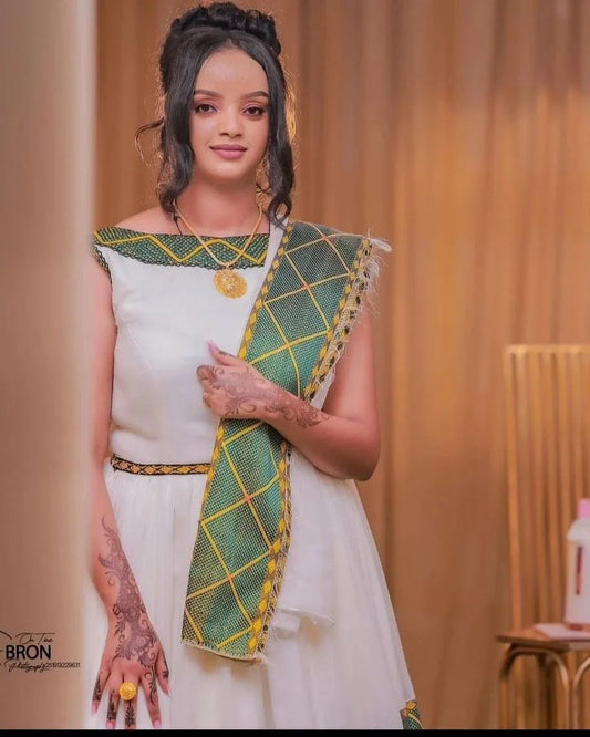 Green Wide Tilet Habesha Dress Modern Habesha Kemis Ethiopian Dress Style Traditional Habesha Libs