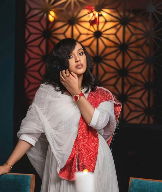 Modern Royalty: Red Menen Elegance in Contemporary Habesha Dress Habesha Kemis