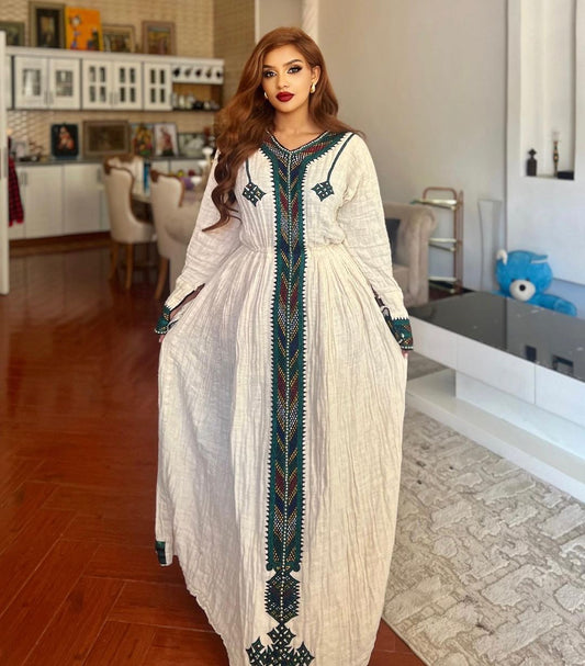 Chic Elegance: Gorgeous Habesha Dress with Exquisite Patterns in Menen Fabric and Cotton Blend