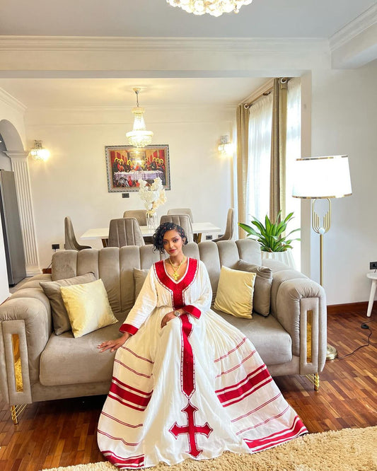 Regal radiance menen fabric habesha dress with golden cross details habesha kemis