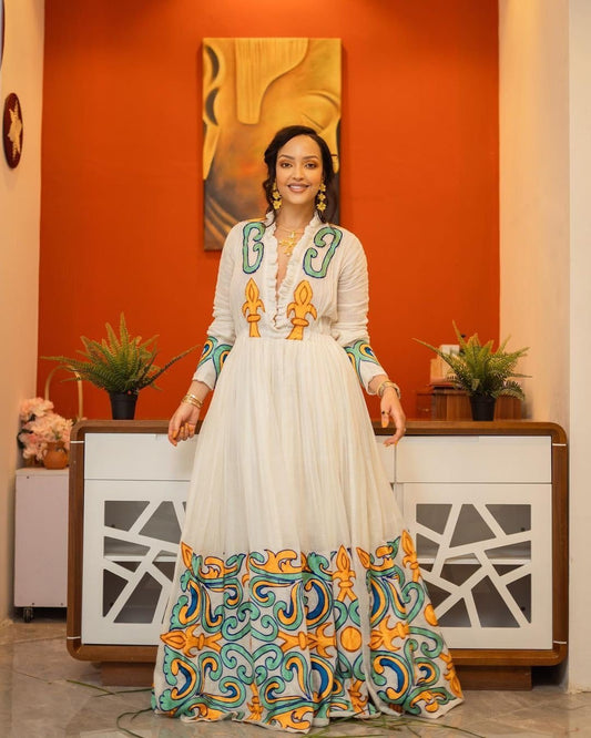 Majestic Menen Kemis with Vibrant Tilf and Shimena Design, Habesha Kemis, Eritrean dress, ሀበሻ