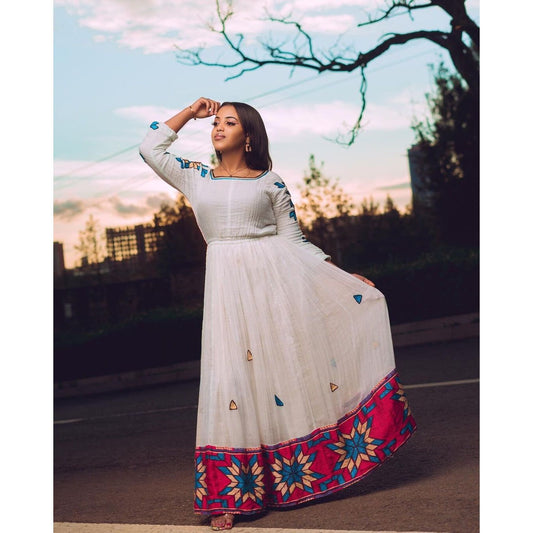 Enchanting Shimena Dress with Vibrant Tilf Pattern, Habesha Kemis, Eritrean dress, ሀበሻ
