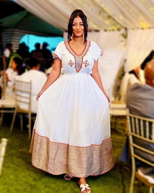 The Simple Shimena Habesha Dress with Tilf Accents and Menen Fabric, habesha libs, habesha kemis, ሀበሻ