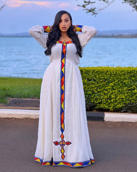 Colorful Shimena Habesha Dress with Tilf Accents and Menen Fabric, habesha libs, habesha kemis, ሀበሻ