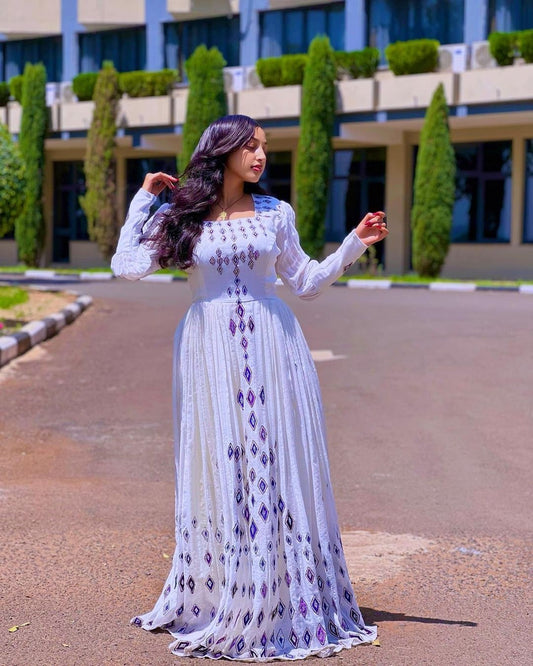 Fully Embroidered Habesha Dress with Menen Fabric, habesha libs, habesha kemis, ሀበሻ