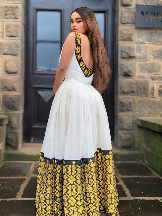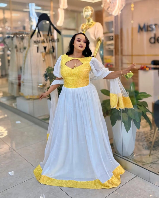 Bright Yellow & White Habesha Dress Elegant Traditional Ethiopian & Eritrean Dress Timeless Habesha Kemis 128