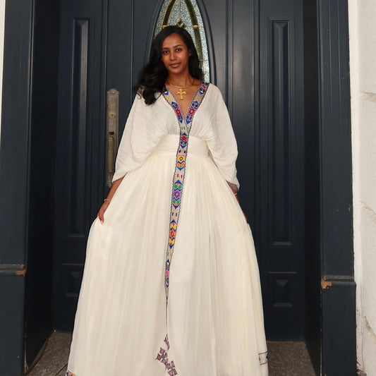 white embroidered Ethiopian traditional dress Habesha Kemis For Special Celebrations Long Sleeve Habesha Dress 176