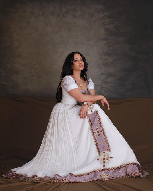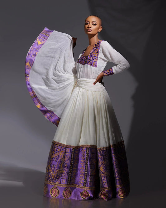 white and purple embroidered ethiopian traditional dress habesha Dress For Festive Timeless Habesha Kemis 173