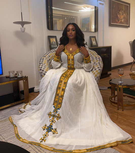 Yellow & Blue Cross Embroidery Habesha Dress White Ethiopian Traditional Dress Festive Habesha Kemis 168