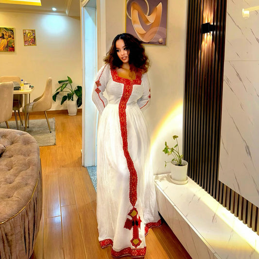 Modern Habesha Traditional Dress Sleeveless Ethiopian Cultural Gown Red & White Embroidery Habesha Kemis Handwoven Habesha Dress 111