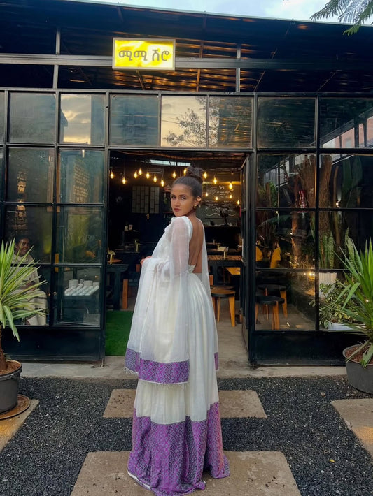 Open-Back Ethiopian Habesha Kemis Layered Purple Tibeb Ethiopian Cloth Stunning Habesha Dress For Celebrations 100