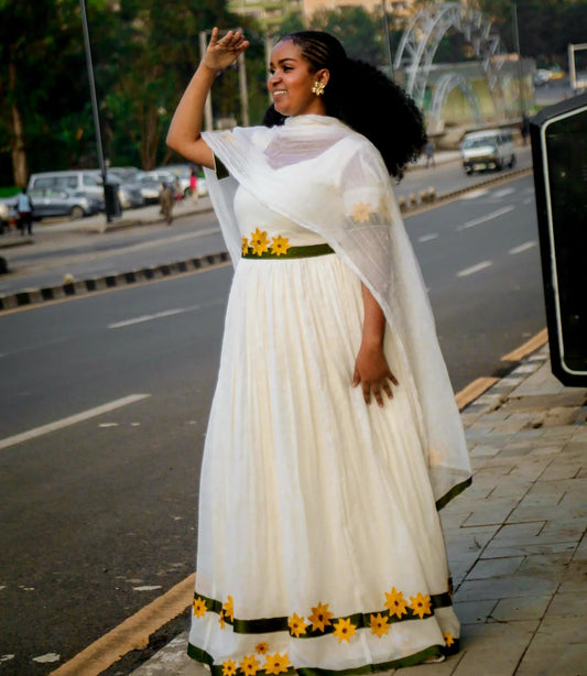 Stunning White & Green Traditional Ethiopian Dress Hand-Embroidered Habesha Kemis Authentic Habesha Dress For Special Events 0062