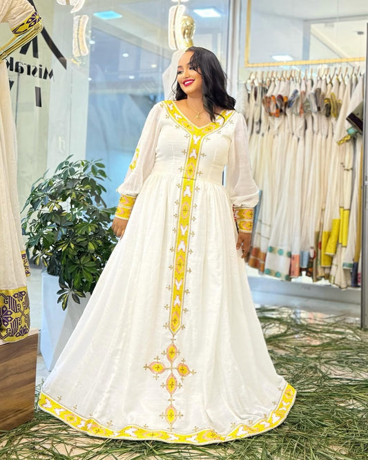 Yellow & White Habesha Kemis Traditional Ethiopian Clothing Cross Design Habesha Dress 108