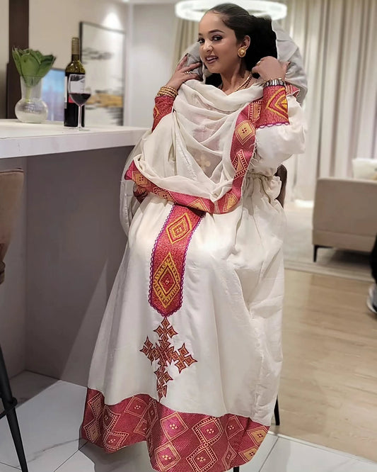 Ethiopian Habesha Kemis with Red Cross Motif Traditional White Habesha Dress Beautiful Ethiopian Cloth For Festive 0094