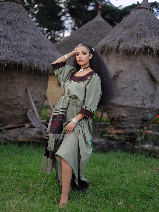 Traditional Ethiopian Cultural Dress Earth-Toned Design Habesha Dress with Netela Handwoven Habesha Kemis 0076