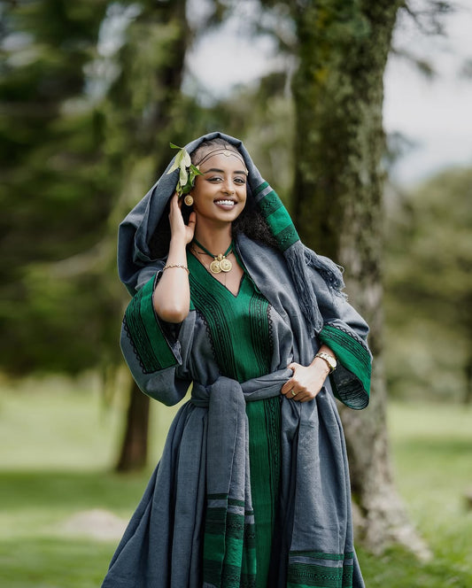 Green and Grey Habesha Kemis Handwoven Ethiopian Traditional Dress Habesha Dress for Special Events 0077