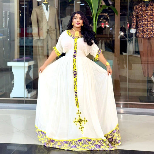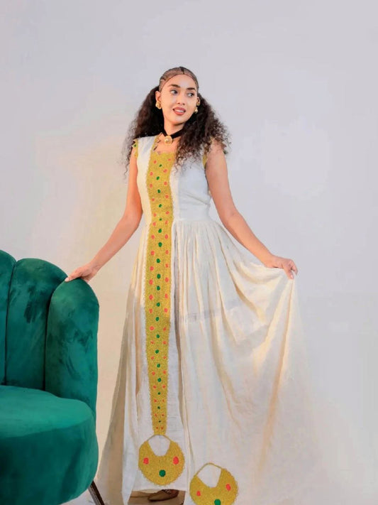 Yellow & Multicolor Detailing Ethiopian Cloth Vibrant Ethiopian Habesha Dress Handwoven White Fabric Habesha Kemis 0082
