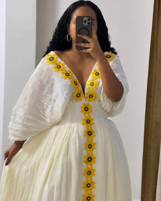 Ethiopian Traditional Dress Yellow Floral Embroidery Habesha Kemis Beautiful Habesha Dress For Enkutatash 0084