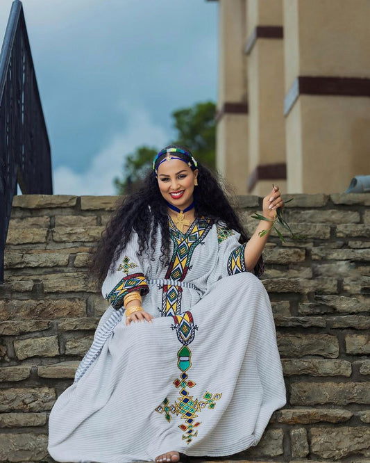 Vibrant Ethiopian Habesha Kemis Colorful Handwoven Tibeb Habesha Dress Cross Embroidery Ethiopian Clothing 102