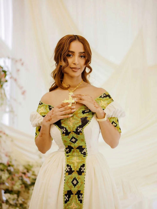 Unique Cross Tibeb Embroidery Ethiopian Clothing Green-gold Pattern Habesha Dress Graceful Habesha Kemis For Events 106
