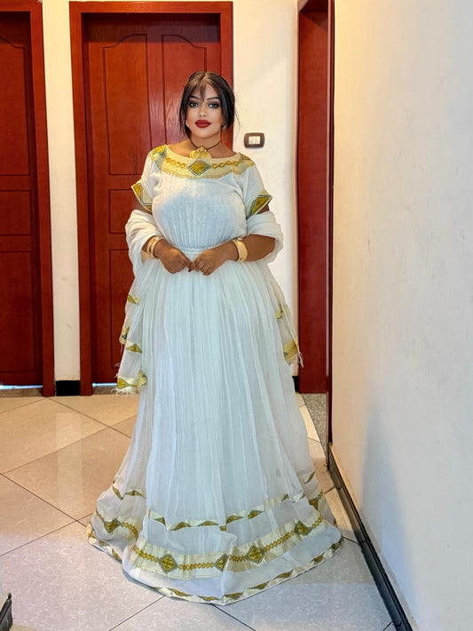 Elegant Habesha Traditional Dress Ethiopian & Eritrean Cultural Clothing White & Gold Habesha Kemis Geometric Pattern Habesha Dress 109