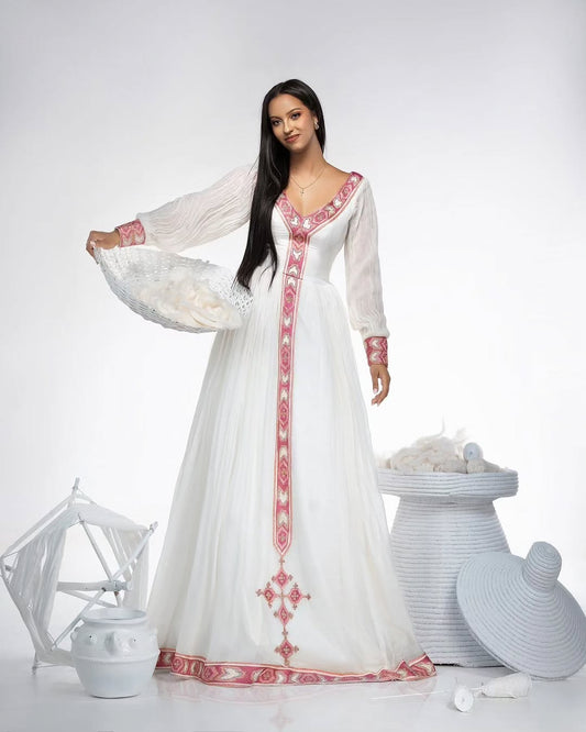 Modern Habesha Dress White Traditional Skirt & Pink Tibeb Vest Habesha Kemis Perfect Blend Of Habesha Cloth 0045
