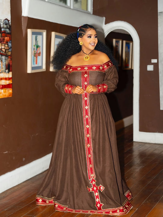Cultural Habesha Dress Brown & Red Design Habesha Kemis Elegant Habesha Cloth 0016