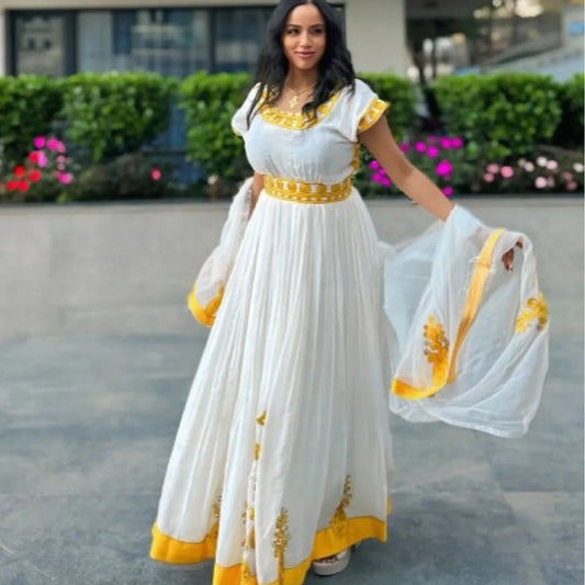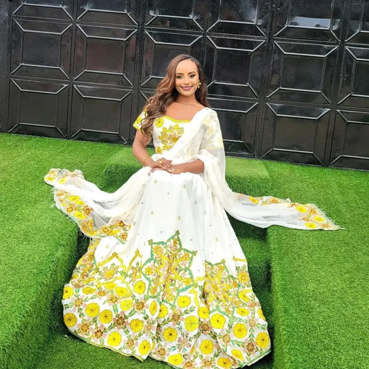 Radiant Yellow Floral Embroidery Ethiopian Traditional Dress Elegant Habesha Kemis With Ethiopian Clothing 0020